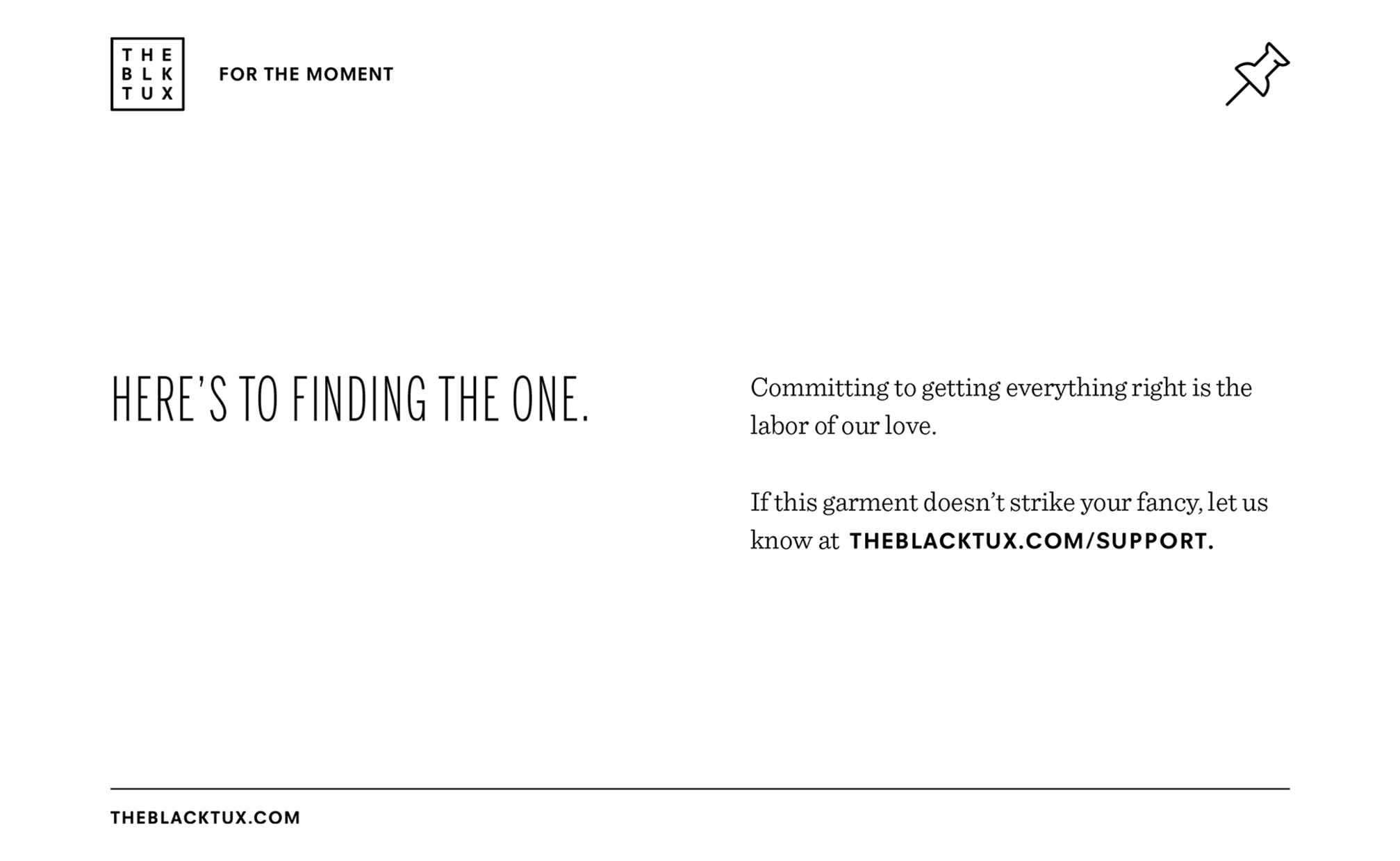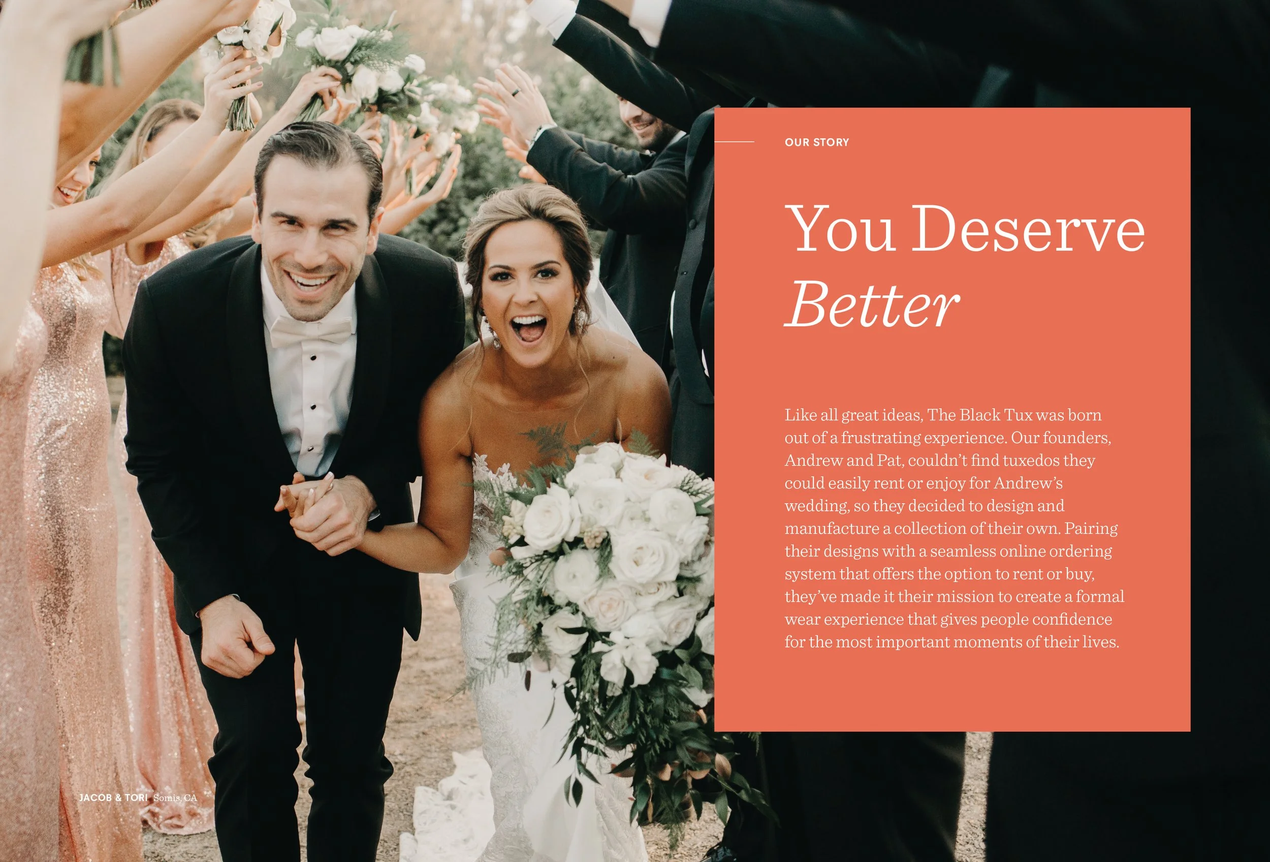 Interview real customers, develop insights and rewrite the brand narrative across key touchpoints: The Black Tux website, podcast ads, lookbook, emails, event collateral and in-box inserts.